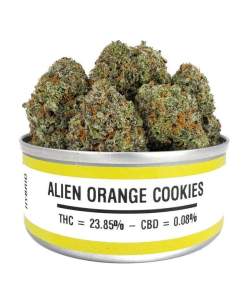 in contrast, Alien Orange Cookies is a slightly Sativa dominant hybrid strain (60% Sativa/40% Indica) created through crossing the infamous Alien Tahoe OG X Lemon Alien Dawg strains. also, This potent powerhouse boasts hard-hitting full-bodied effects that will leave you totally dazed after just a single toke thanks to its super high 20-25% average THC level. besides, The Alien Orange Cookies high starts in the head, slamming into your brain with a super lifted effect that launches your mind into pure euphoric bliss. As your mind soars higher and higher, you’ll feel an influx in motivation and focus that lends itself well to any task you have at hand.